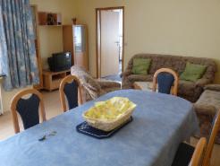 Die Wohnung ist ca. 90 m² groß und für max. 6 Personen geeignet. Es sind 3 getrennte Schlafräume vorhanden; Zwei mit jeweils einem Doppelbett und ein Schlafraum mit getrennt stehenden Betten. Bei Bedarf stehen Kinderbett und Kinderstuhl zur Verfügung. Weiterhin ist ein großes Wohn-/Esszimmer mit SAT-TV, eine vollständig eingerichtete Küche (Kaffeemaschiene, Wasserkocher, Mikrowelle, Toaster, Herd mit vierplatten Cerankochfeld und Backofen) ein Bad mit Waschbecken und Duschbadewanne, sowie ein weiteres WC mit Waschbecken vorhanden.